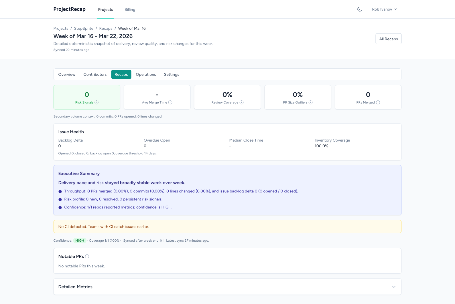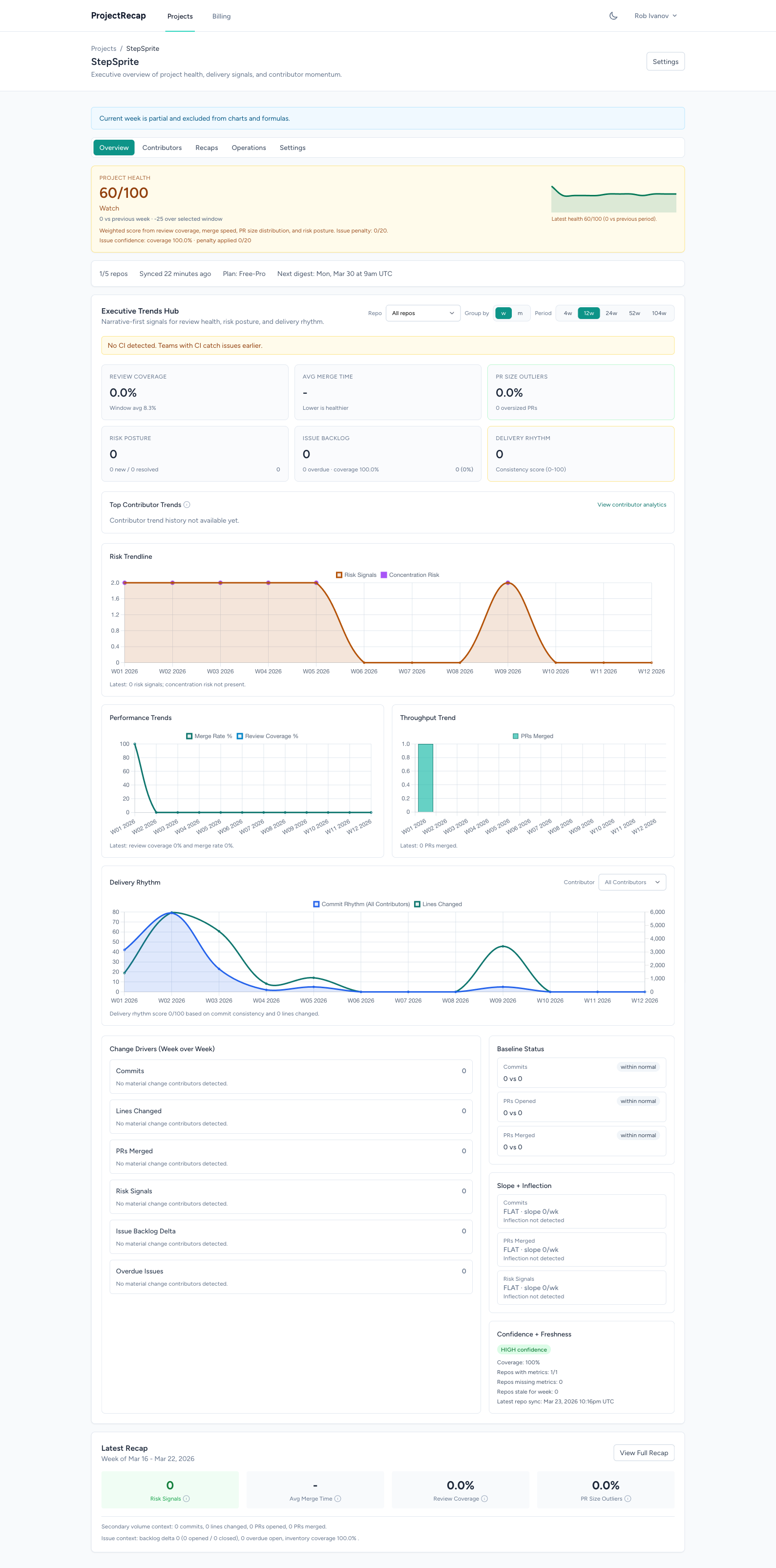 ProjectRecap turns GitHub activity into a weekly founder brief. See what shipped, what slowed down, and where risk is building without pulling your lead dev into another status meeting.